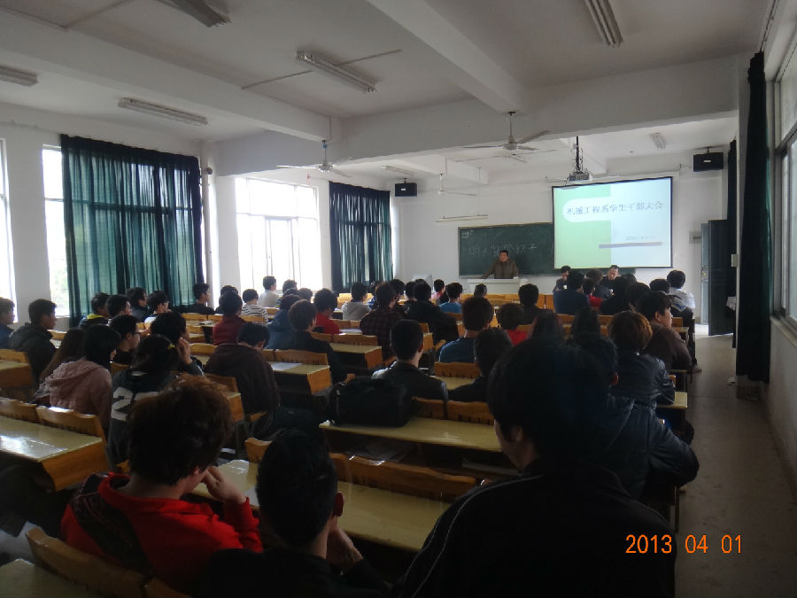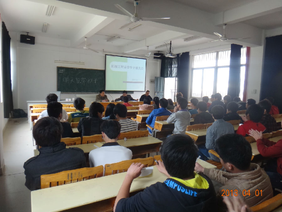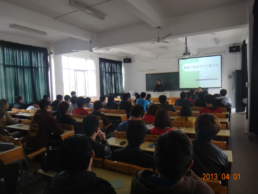 当前位置: 系部首页>学生工作2013年4月1日下午4点30分,在33号楼303教室召开了机械工程系新学期的学生干部大会。全部学生干部参加会议,与会领导有系主任徐维雄,系书记李仲清,会议由团总支负责人林俊主持。