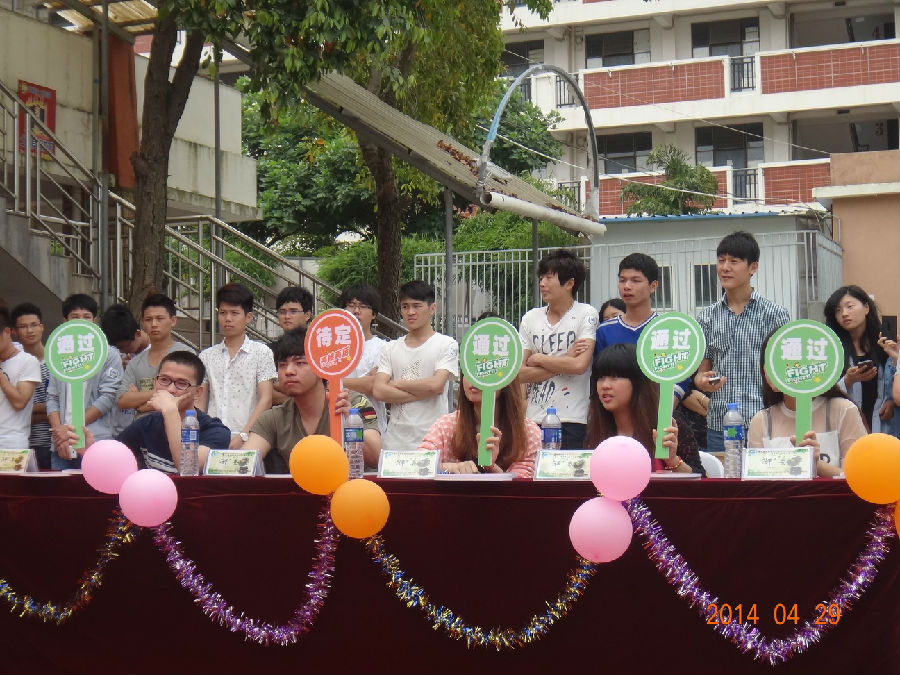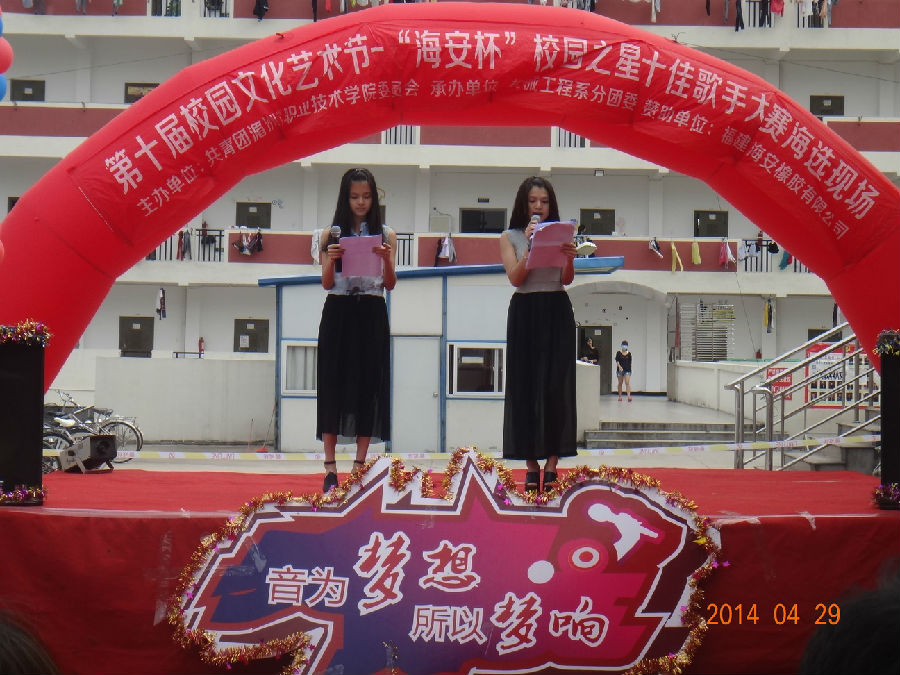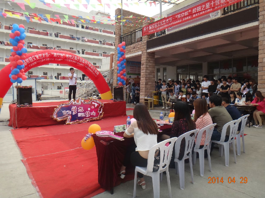 渐入初夏的校园有了点点热意,2014年4月29日下午两点,在秋食园食堂门口,第十届校园文化艺术节“海安杯”校园之星十佳歌手大赛海选下半场中,歌手们的激情又被点燃,火爆的音乐和张扬的个性,驱走了心中的热意,将天空画得一片炫彩。