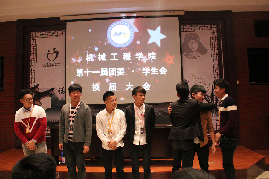 整个流程是从主持人致开幕词开始的,接下来是四位领导讲话,四位领导分别是“机械工程学院党总支-许志敏 副书记”、“机械工程学院分团委书记-翁歆老师”、“15届机械系大一辅导员-黄剑萍老师”和黄心闲老师,接下来是向机械工程学院第十届团委、学生会成员颁发聘书,接着是大三的人的PPT播放和在职经历,接下来的环节是给大三的颁发荣誉证书,任命机械工程学院第十一届团委、学生会成员,然后接下来是给大二的主席,副主席,团副演讲的时间,然后是大二当职的每位部长介绍部门职责及其成员,然后是前任部长给现在的部门成员戴牌子,然后接下来是给最美代班颁发奖状,接着是“机械工程学院分团委书记- 翁歆老师”讲话。最后是给大三同学的惊喜,机械工程学院第十一届团委、学生会成员献歌祝福第十届两委会成员,一起唱了《再见》这首歌给他们送别。