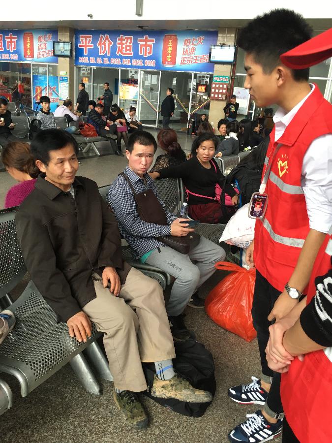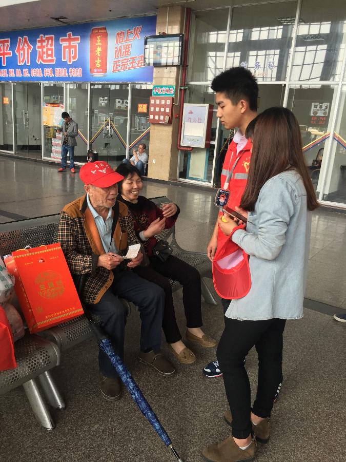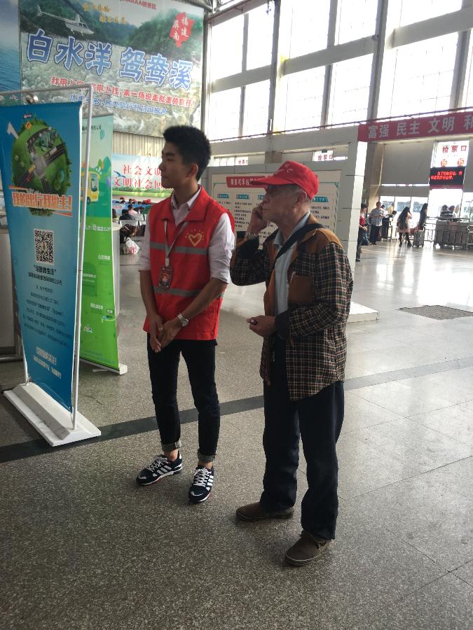 这位老大爷找到我们的志愿者,着急地说他的老伴去售票厅买车票,好久人都不回来,不知道走到哪里去了,在志愿者的提醒下,老大爷才想起来可以给老伴打个电话。最后我们的志愿者陪着老大爷等来了他的老伴,还帮他们看了车票,反复叮嘱他们上车的时间后才离开。