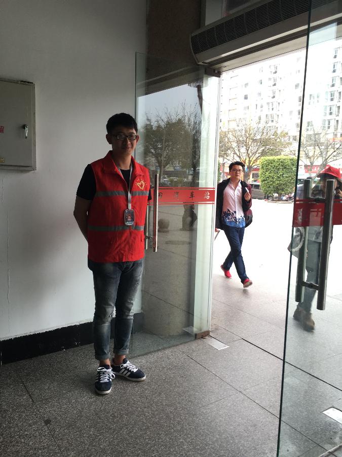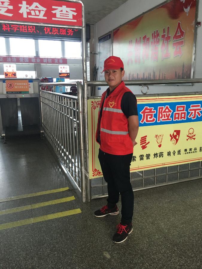 在汽车站与安检入口,都有两位志愿者面带笑容地提醒大家接受安全检查,并示意他们如有困难可以寻找戴着小红帽或者穿着小红马甲的我们的志愿者同胞。