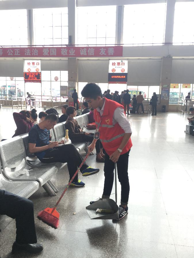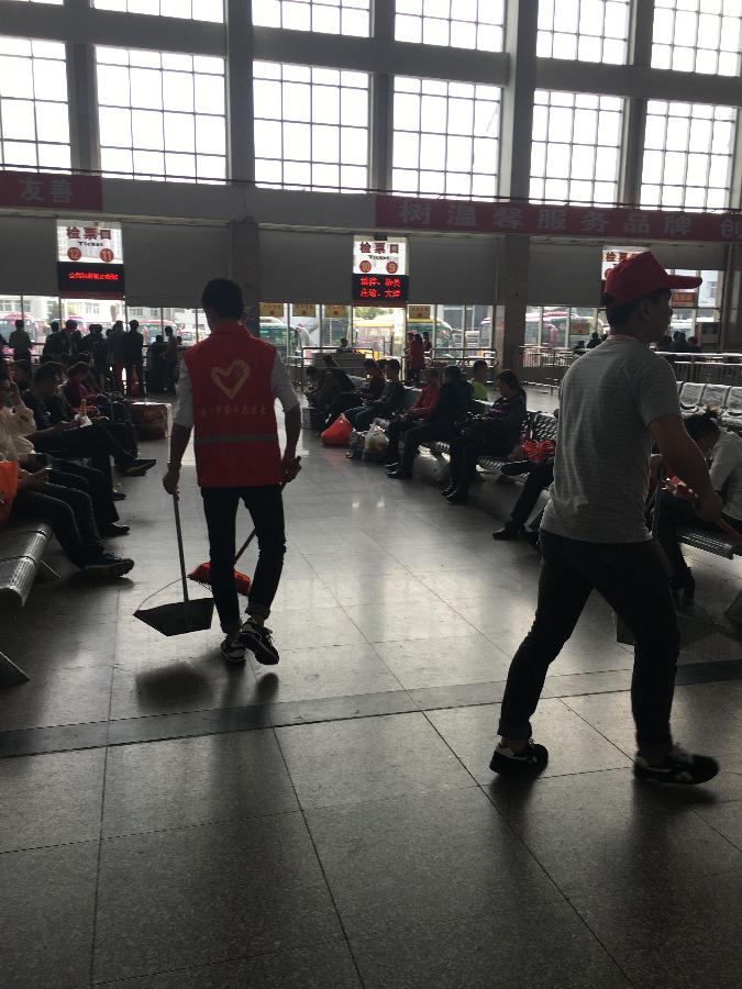 天色越来越暗,在志愿服务即将结束时,我们的志愿者提出为候车厅做一下卫生清洁,尽管车站黄主任表示车站有专职保洁阿姨可以做清洁,志愿者们还是拿起了工作就干了起来,没办法,谁让我们是志愿者呢!