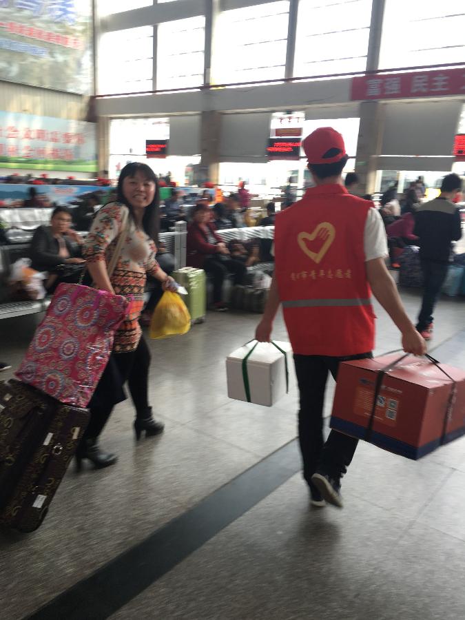 发现旅客行李太多,我们的志愿者自告奉勇地上前帮她一起提行李,看我们的大力士身体素质真是棒,被帮助的大姐笑得多开心!