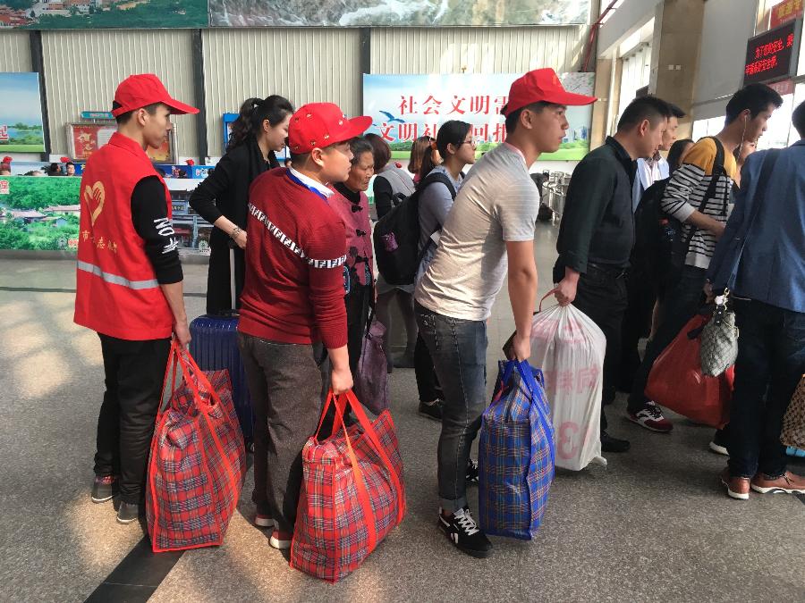 安检口,志愿者们帮助旅客一起提起大包小包的行李。