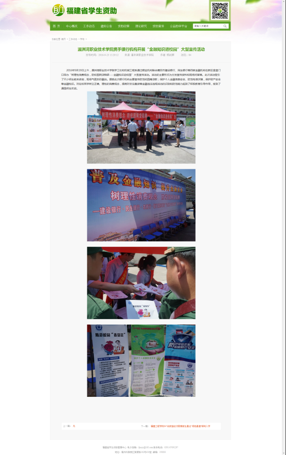 当前位置: 系部首页>学生工作2016年9月19日上午,学院学工处、机械工程学院通过莆田市银监局牵头莆田市建设银行、民生银行、农商银行、厦门国际银行等四家金融机构在新区食堂门口举办“树理性消费观念,防校园网贷陷阱——金融知识进校园”大型宣传活动。活动的主要形式为分发宣传资料和现场问答等。此次活动吸引了不少师生前来咨询,现场气氛热烈融洽。据悉此次银行机构主要宣传防范校园毒贷款;保护个人金融信息安全、防范电信诈骗,保护财产安全等金融知识。对在校同学树立正确、理性的消费观念,提高对非法集资等金融违法违规活动的识别和防范能力起到了积极教育引导作用,受到了湄园师生欢迎。
