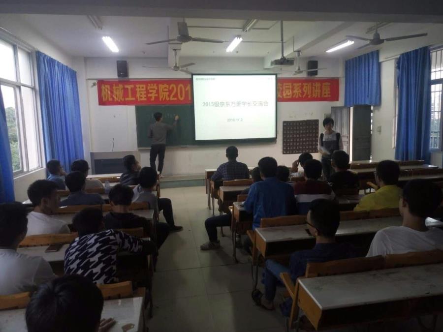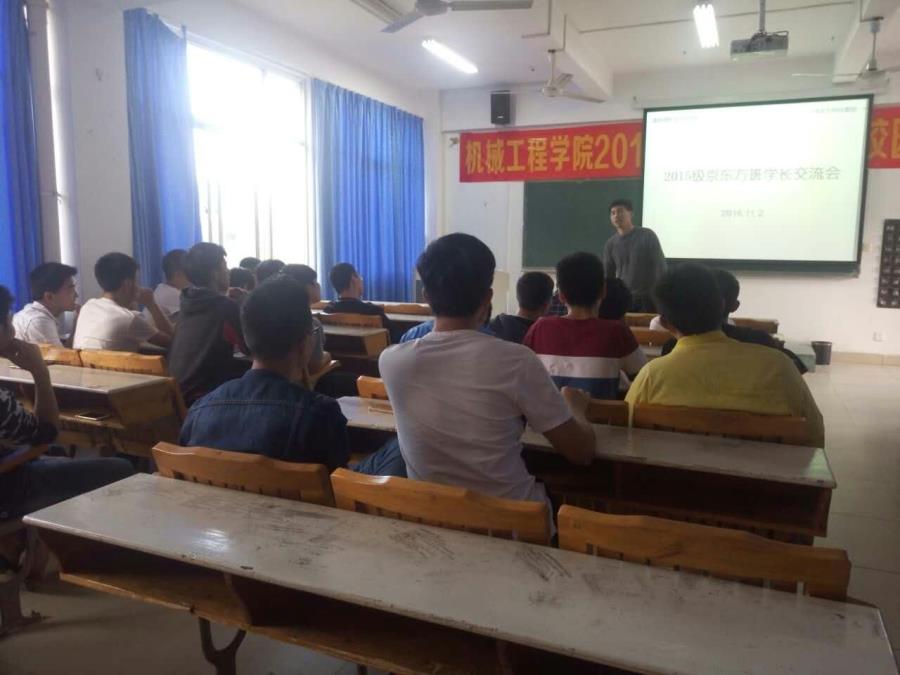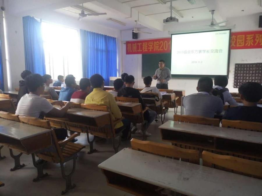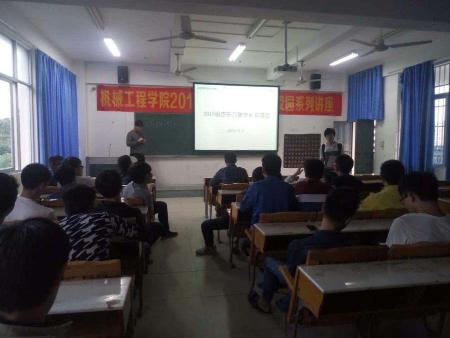 11月2日,我校第一批京东方班兼第十一届机械系分团委学生会主席的江雨生学长和颜万兴两位学长在自己放假期间来学校看望我们,同时趁这个机会,大家便在下午4:20开展了京东方班新老生交流会。