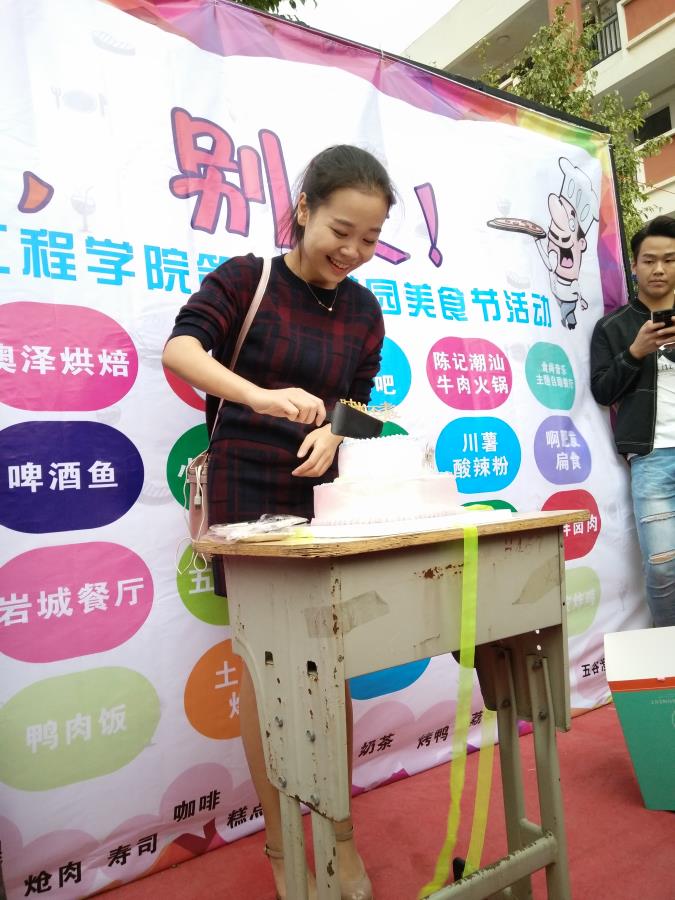 湄洲湾职业技术学院一年一度的美食节在活动结束的末尾,由翁歆老师为本次的美食节生日切蛋糕,各个部门以及各位干事的共同努力终于成功的结束了。
