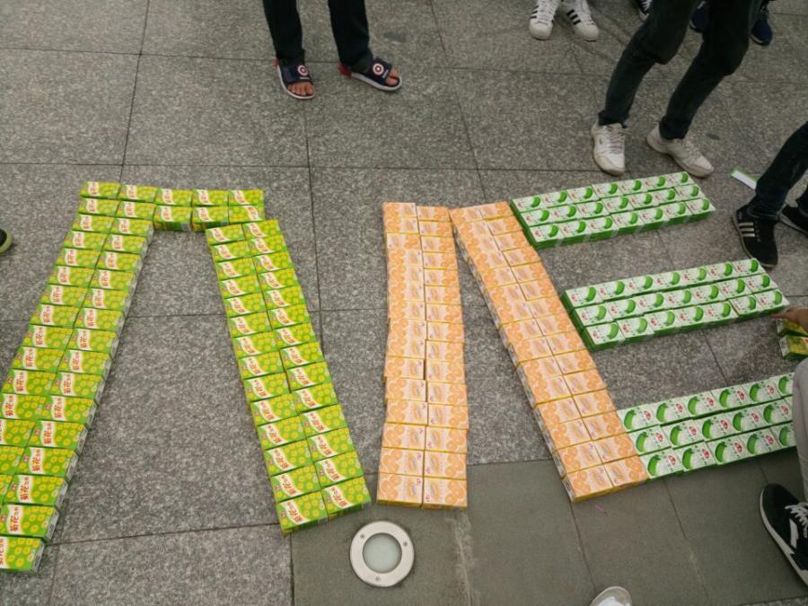 大家用现有的饮料来摆我系的系标“ME”