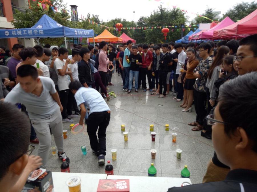 在喝可乐吹瓶的游戏中,比谁喝的快得到五个圈,慢的三个,站在远处投,看谁能套中哪瓶就得到它。在这么规则的调动下,围观和参赛的同学的神经都被紧绷起来。这个游戏充满着未知和挑战,很符合大家的取向。当然其中也有搞笑,也有感动,极大的减压了大家的情绪。
