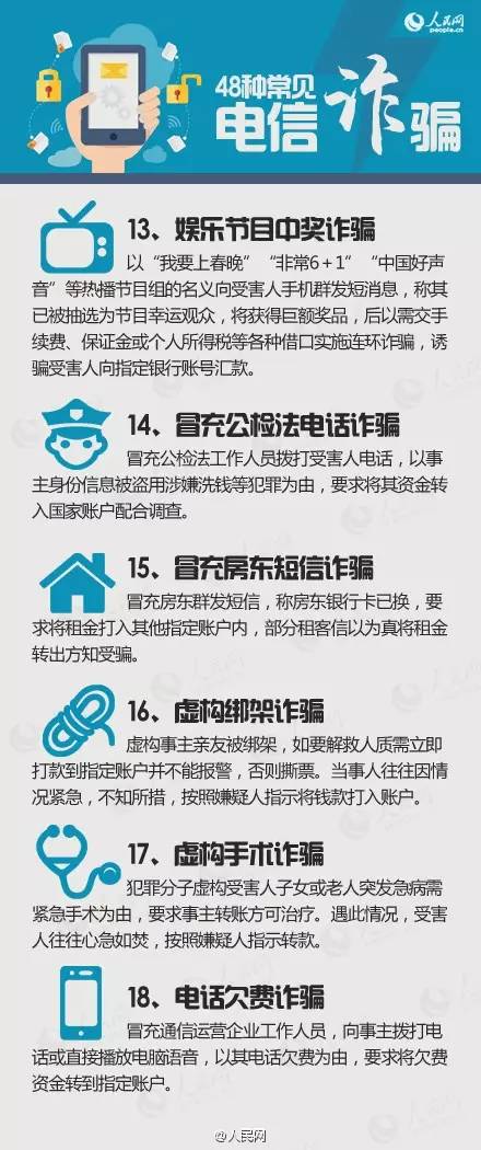 近些年,随着网络科技的发展,通讯技术的进步,电信诈骗不但没有减少,反而增加了很多。这是因为一些所谓的科技骗子作案的技术手段也高明了很多,只需要受害者点击一下手机短信链接或者回复一下编码,就可以把钱轻轻松松的划走。现在小编给你介绍防范电信诈骗的“6个一律+8个凡是+48种手段”,请看客们多转发,帮助身边朋友防范诈骗!