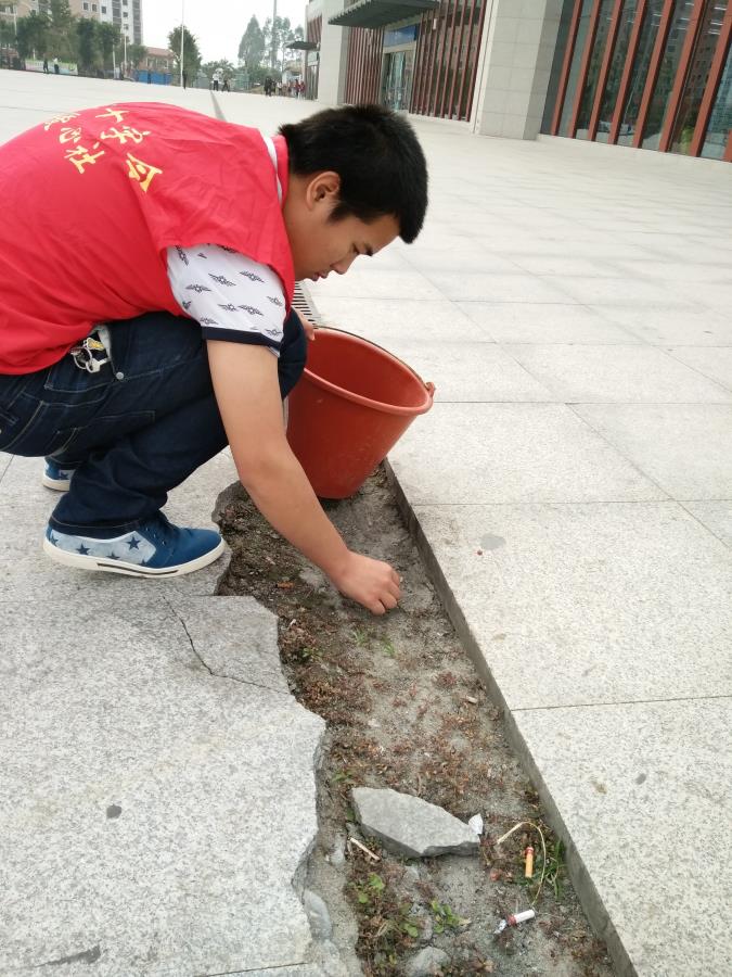 小伙伴们正在为动车站周边进行打扫卫生