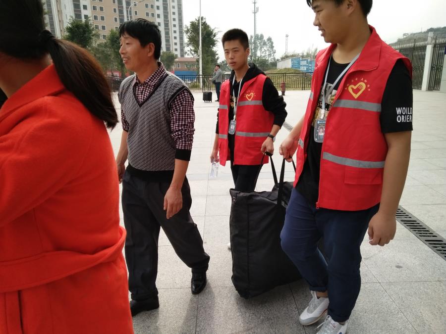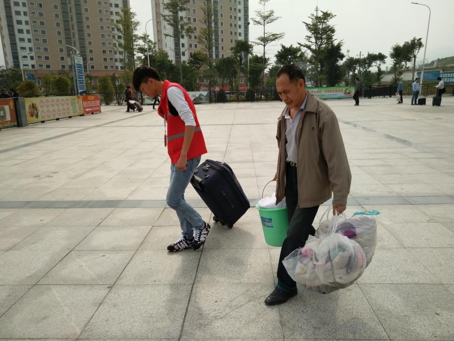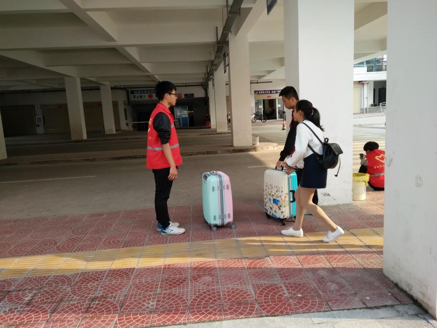 机械系的小伙伴们为旅客提行李