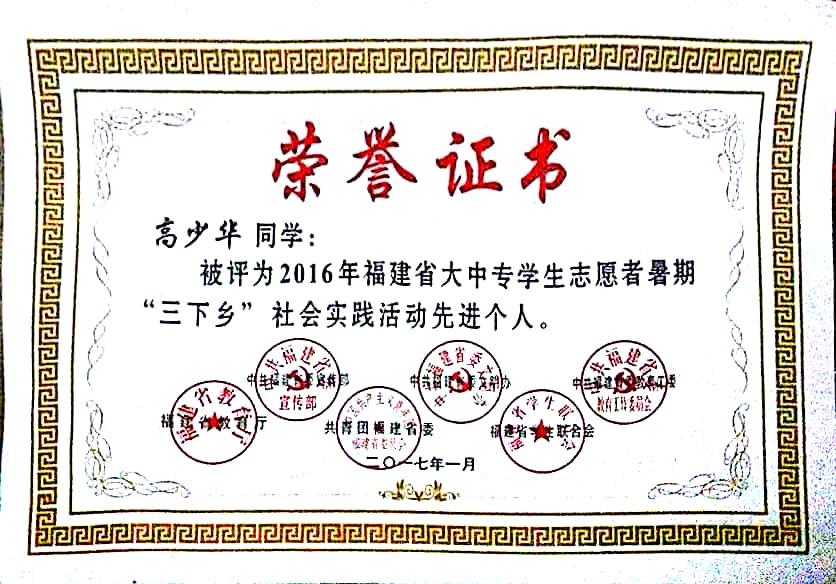 喜讯:机电142高少华同学被评为2016年福建省大中专学生志愿者暑期“三下乡”社会实践活动先进个人