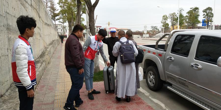 同学们积极的帮助乘客们提行李,乘客们纷纷竖起大拇指并且和同学们拍照留念