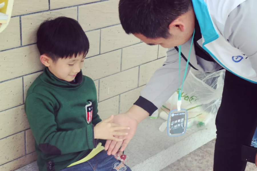 图为细心的志愿者与一旁休息的小朋友互动