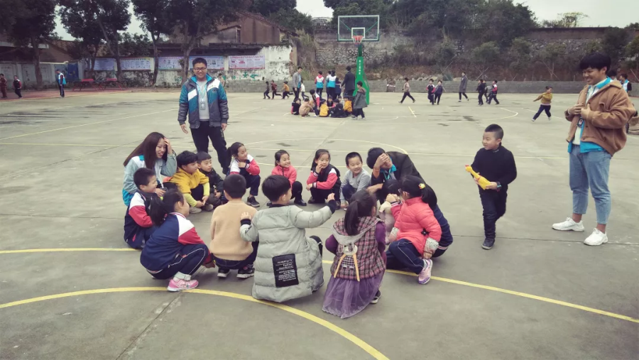 也许是被志愿者们的热情感染,天渐渐放晴,志愿者们带领小朋友们来到操场玩起游戏。这边在玩老鹰抓小鸡,那边在玩一二三木头人。欢声笑语充满了操场的每个角落,小朋友们的童真也感染着每一个志愿者。