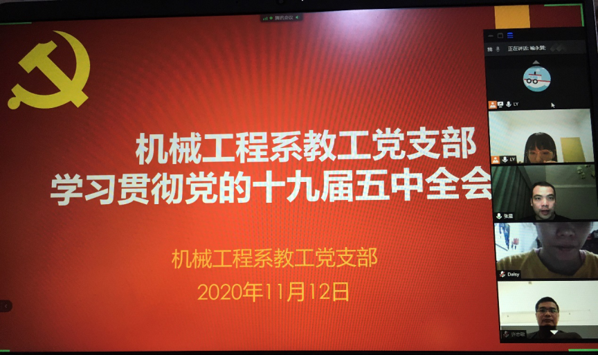 当前位置: 系部首页>最新消息11月12日,机械工程系教工党支部在线上举行理论学习会议,传达学习党的十九届五中全会精神,教工支部全体党员参加了此次活动。
