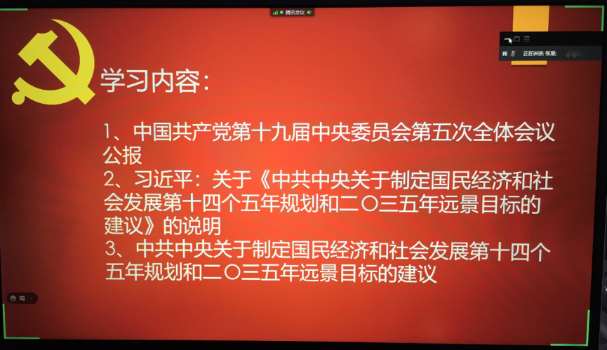 教工支部书记张星同志组织大家共同学习了中国共产党第十九届中央委员会第五次全体会议公报,传达学习习近平总书记关于《中共中央关于制定国民经济和社会发展第十四个五年规划和二〇三五年远景目标的建议》的说明,中共中央关于制定国民经济和社会发展第十四个五年规划和二〇三五年远景目标的建议。会议认为,党的十九届五中全会是在全面建成小康社会胜利在望、全面建设社会主义现代化国家新征程即将开启的重要历史时刻召开的一次十分重要的会议。学习贯彻党的十九届五中全会精神是当前和今后一个时期的一项重要政治任务。