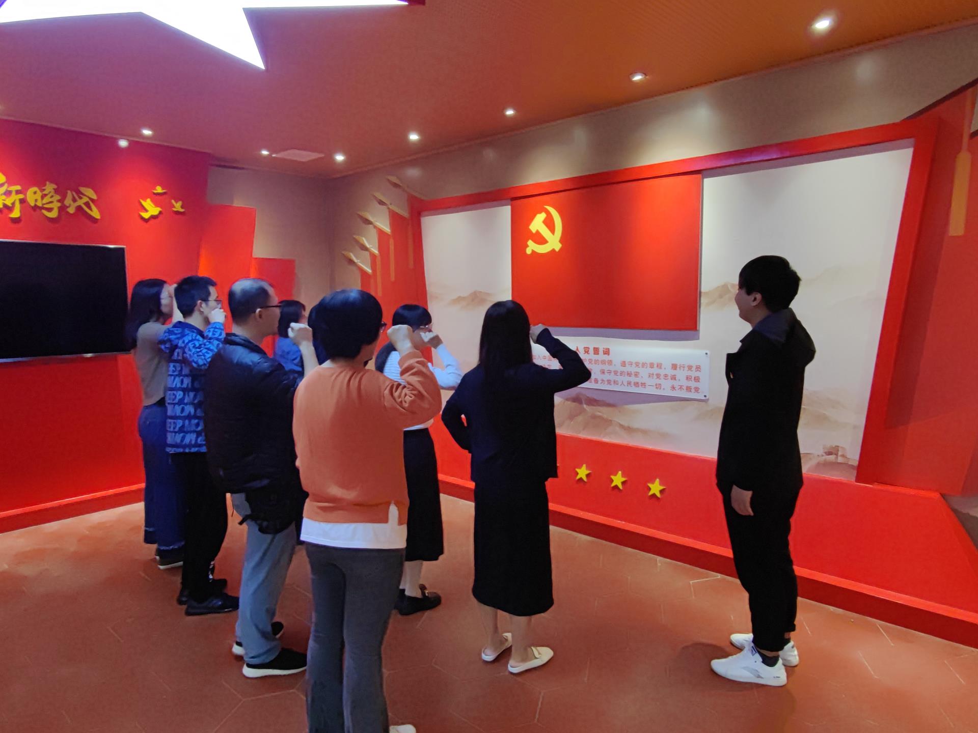 最后,在入党誓词展馆我系学生党支部和教师党支部的党员们向着党旗重温入党誓词,回忆入党时的满腔热血。本次主题党日活动在师生们的心得体会分享中圆满结束。