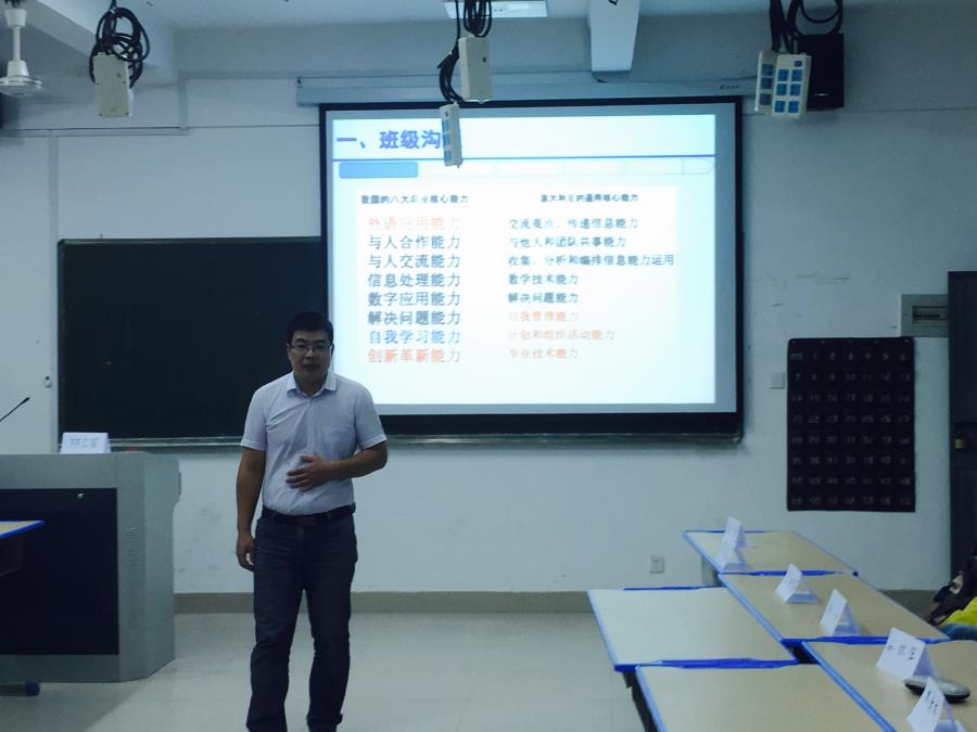 林志荣老师在向同学们讲述本次班会第一方面班级沟通