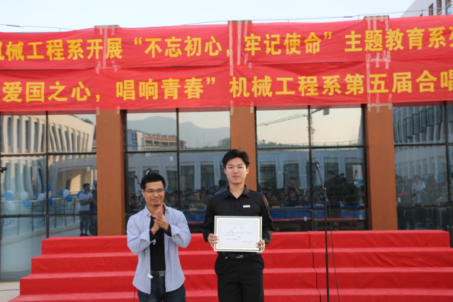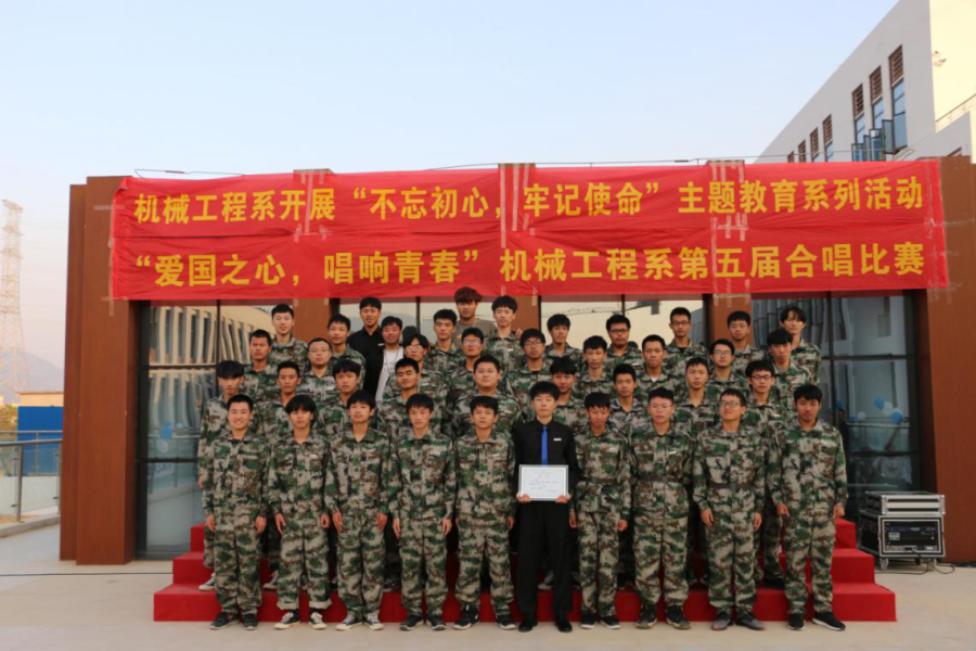 11月14号下午,机械工程系在公教一北二楼平台举办“不忘初心,牢记使命”主题新生合唱比赛,本次比赛邀请到了翁歆老师,黄心闲老师,朱菡老师担任评委,机械工程系主任陆宇立,书记许志敏等多位老师作为本次比赛的嘉宾。随着主持人的热情暖场,比赛开始。