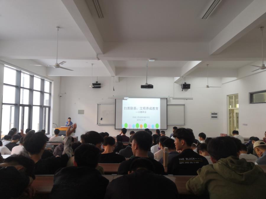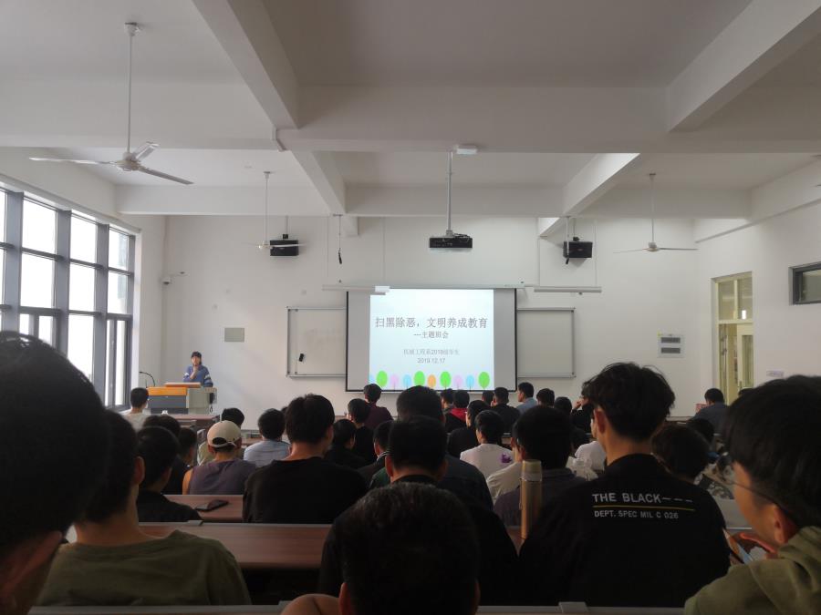当前位置: 系部首页>学生工作为增强机械工程系学生安全隐患防范意识,提高文明素养,2019年12月17日下午,辅导员朱菡于信息楼南104开展‘扫黑除恶,文明养成教育’主题班会。
