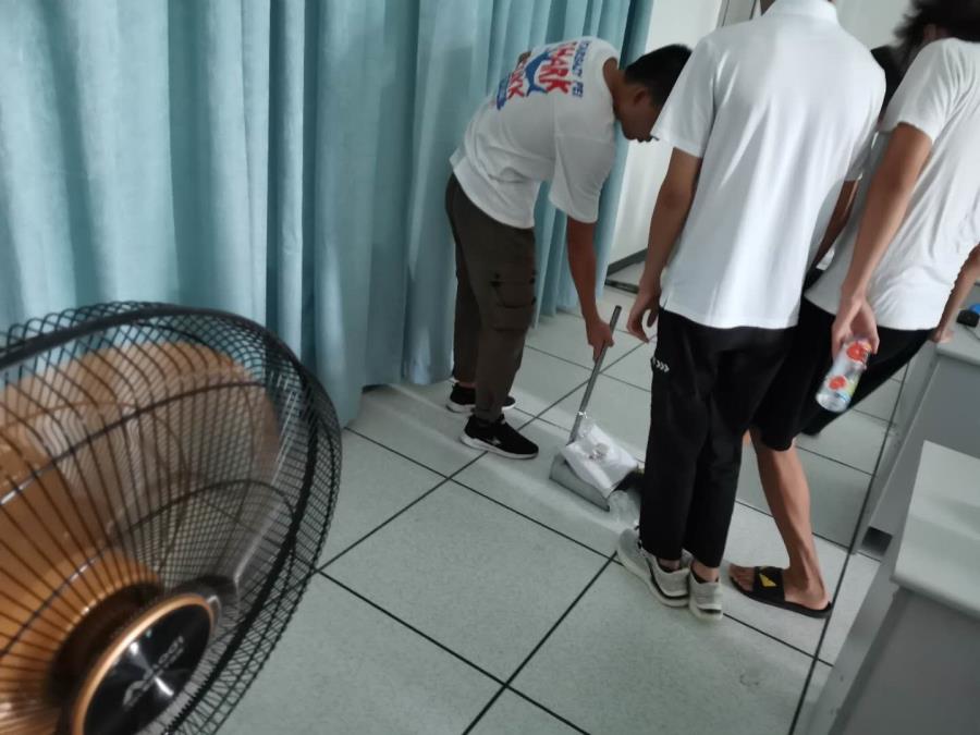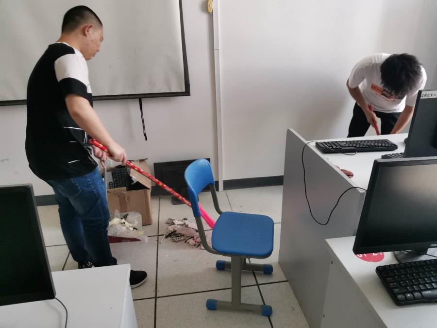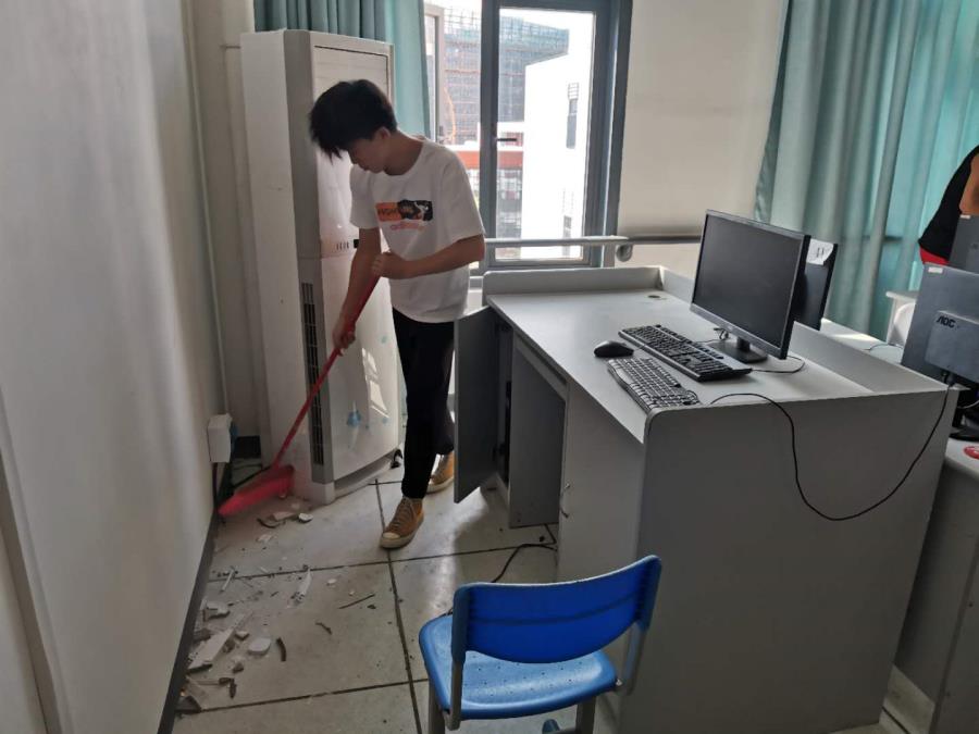 各位同学通过劳动把原本杂乱的机房、教室变得干净整洁,辛勤的劳动使他们汗流浃背,但看着因为他们而变整洁的机电楼,更多的是充满成就感的喜悦。