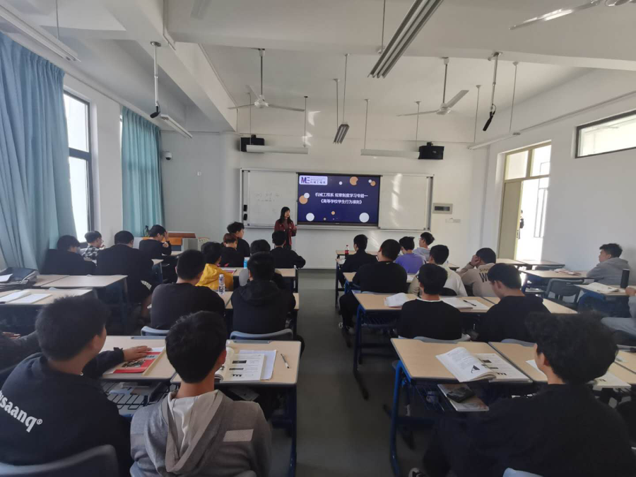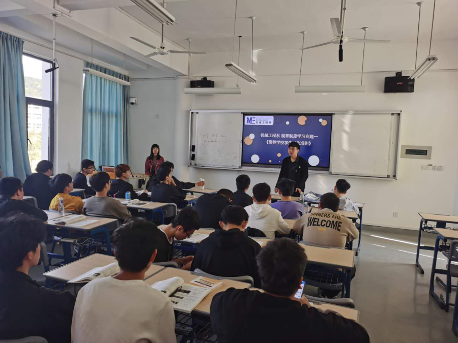 当前位置: 系部首页>学生工作为了增强学生对学院的管理服务规章制度的认识,促进校风、班风建设。机械工程系于2020年10月20日,在公教一北教室开展“懂制度,守规章”《学生教育管理服务规章制度》学习主题教育。参加本次主题学习的有辅导员曾嘉靖、朱菡、邱淑娇、机械工程系2019级学生以及2020级学生。