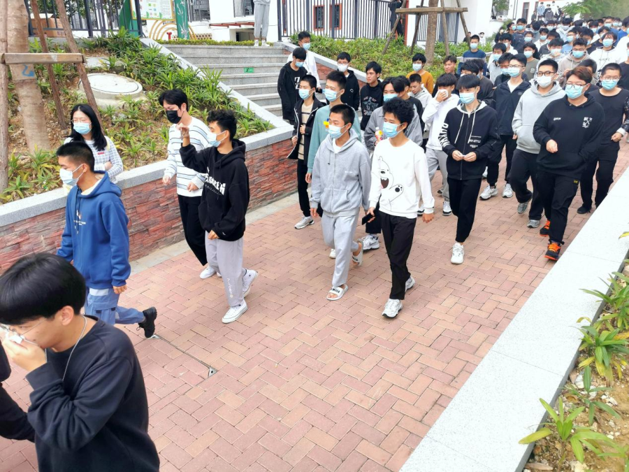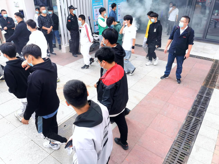 下午14点,随着消防紧急疏散警报声响起,消防演习烟雾在宿舍楼内扩散。同学们在工作人员和老师的组织下迅速有序地从宿舍内撤离到安全地点。
