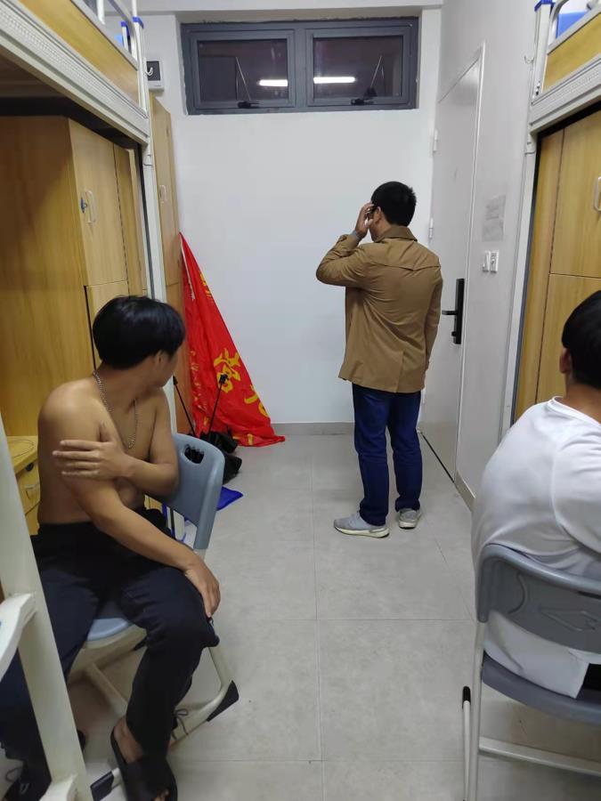 走访期间,陈建武书记给各位学生宣导军训的意义,嘱咐大家要有组织、有纪律,要爱护连旗、连牌。建武书记表扬了学生宿舍期间的内务卫生,教导学生军训内务是课程必过环节,一定要重视并保持。被子整齐叠放也应积极学习并实践。