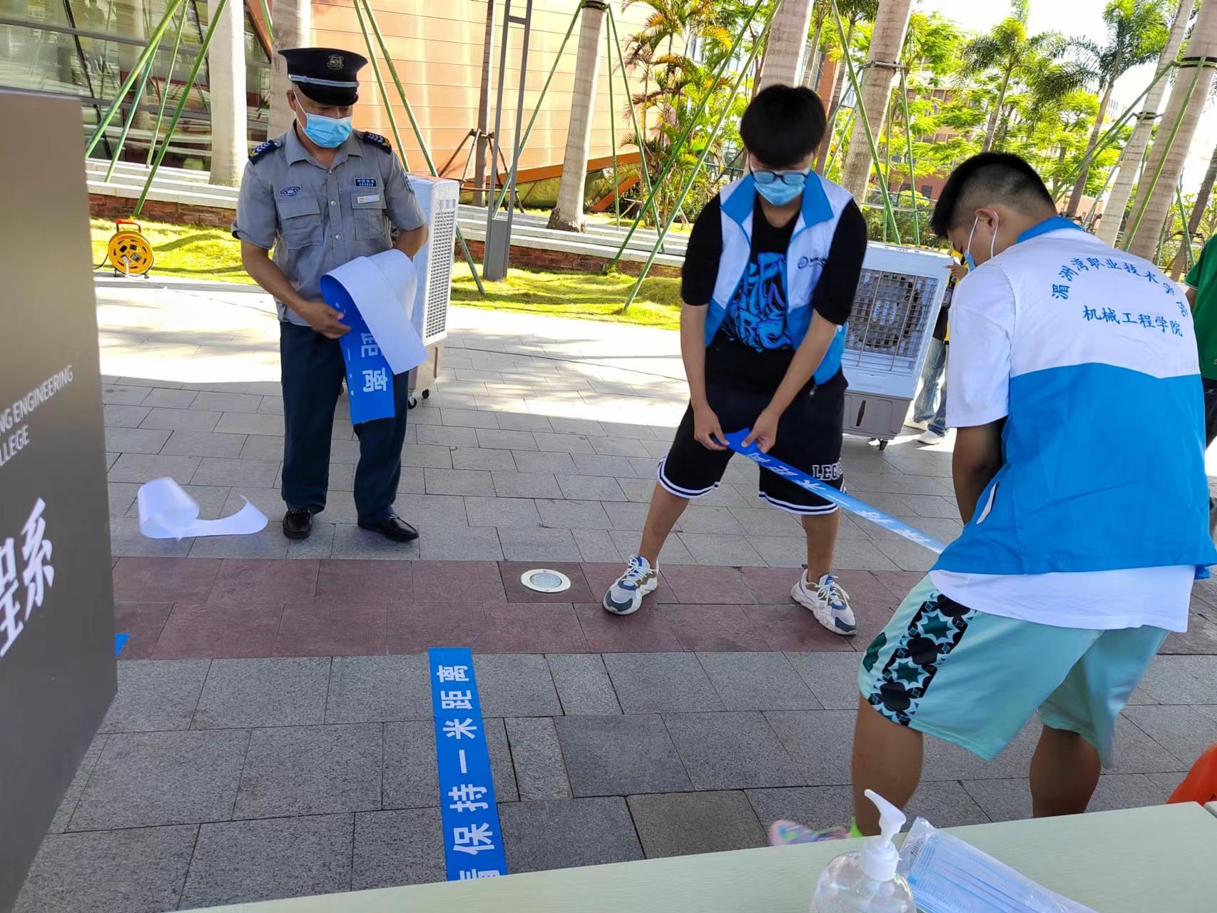 当日上午,志愿者整齐有序在报道点就位,制造男儿们热心帮助保卫处贴一米线标,我系党总支书记陈建武、辅导员邱淑娇、郑仙花现场指导查验返校各个环节。万事俱备,“智”等你归。因夏秋交替,仍高温难耐,建武书记贴心为学生们准备矿泉水、风扇等降温解暑物品,细节处展现智能制造系的柔情。