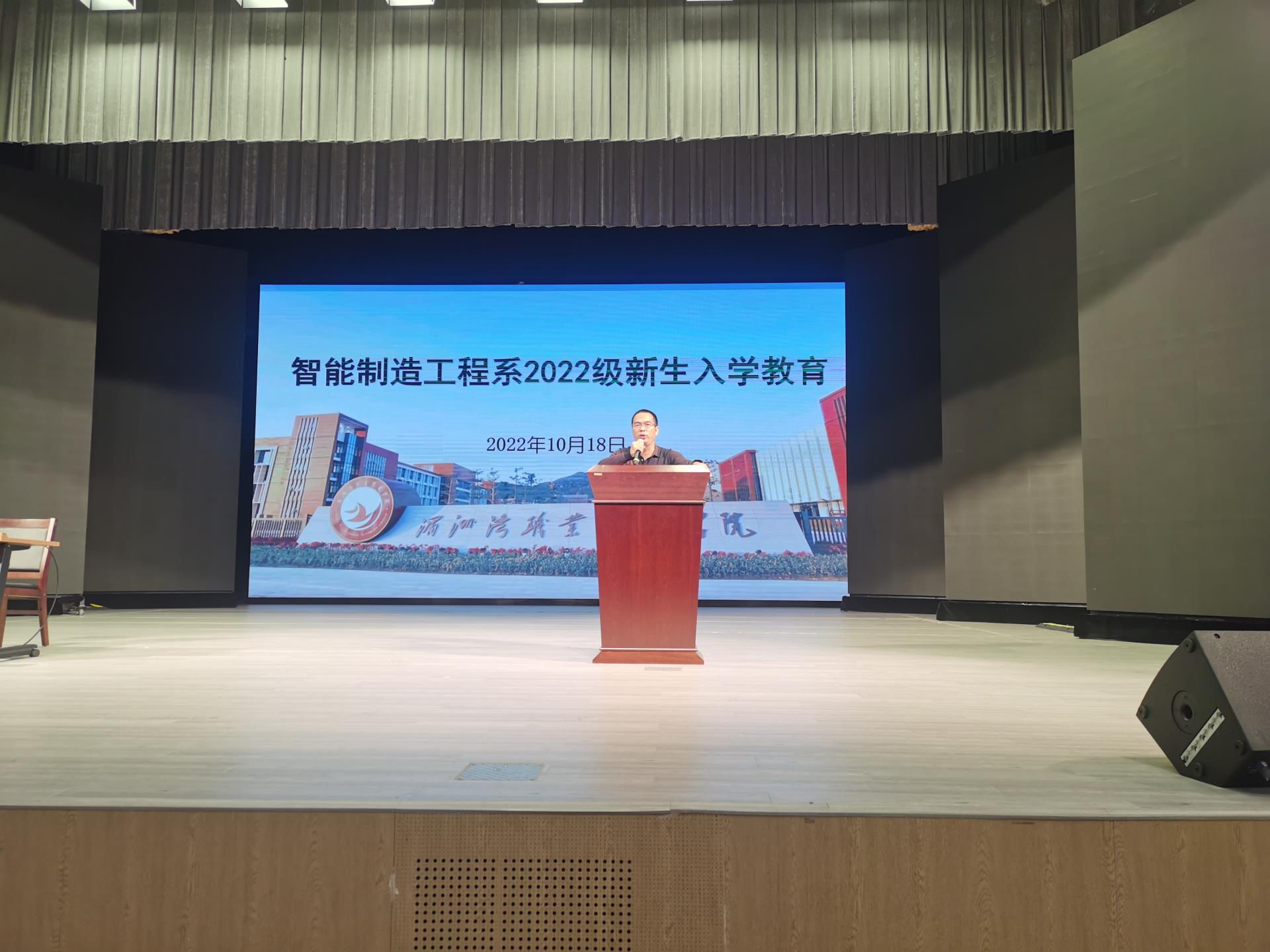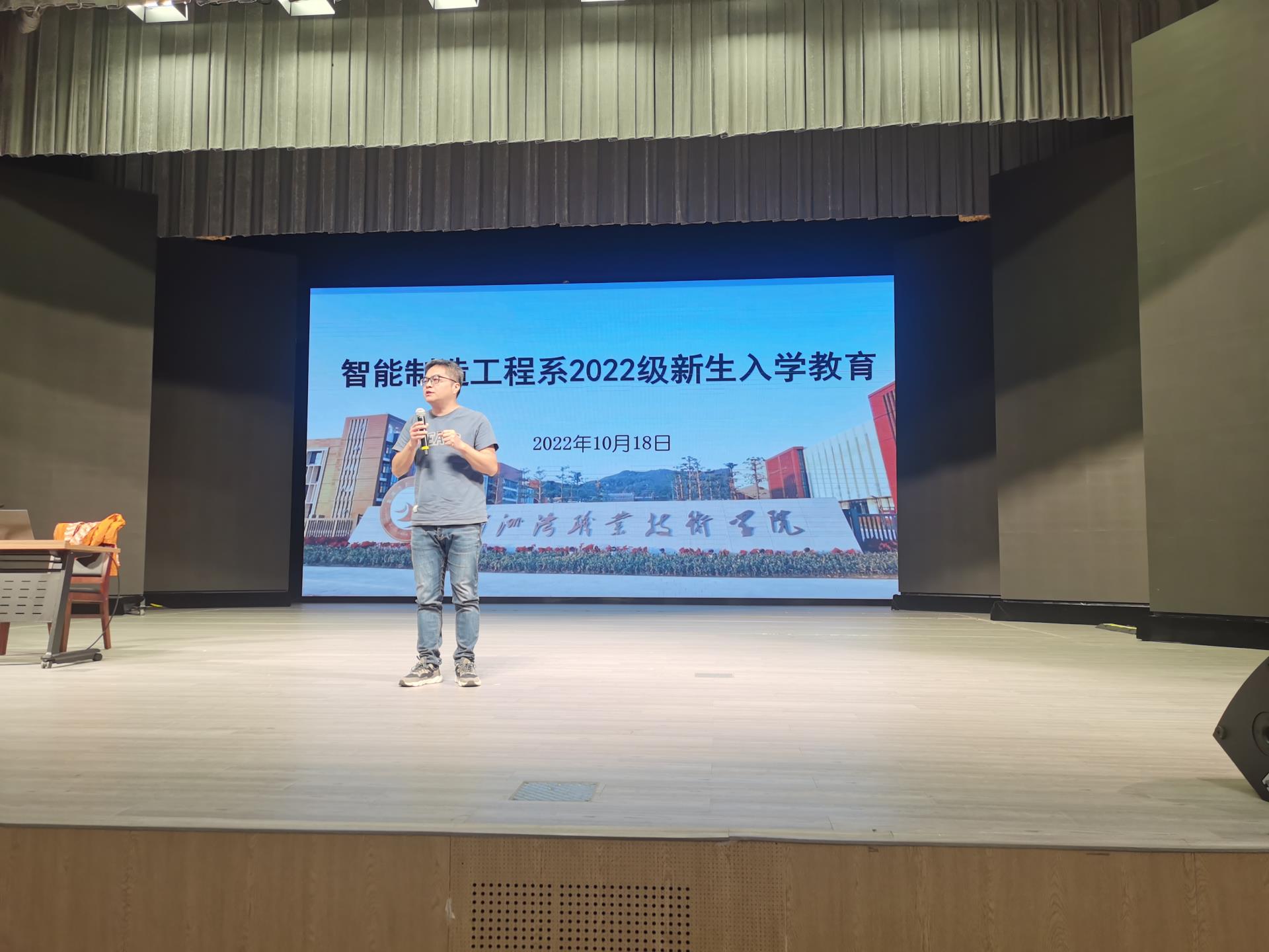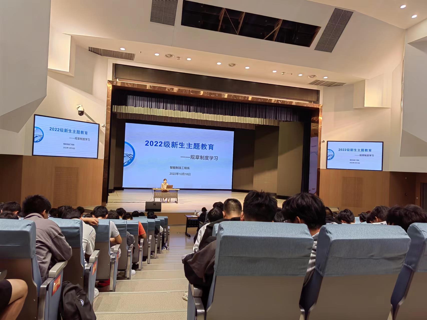 当前位置: 系部首页>学生工作为使新同学能更好的适应大学新生活,更加详细的了解学院,深化大学生理想信念教育,明确校纪校规,时刻注意自身安全。10月18日,我系在立言大礼堂开展“智能制造工程系2022级新生入学教育”。系主任陆宇立、系书记陈建武、系副主任张星、组织员黄剑萍、教学秘书郑俊杰、新生辅导员朱菡、刘小真、吴志超、方榆莉以及22级全体新生参加本次会议。
